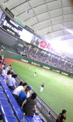 野球はオリックスバファローズ(3塁)側の外野席が空いていたのでそちらに座りまして、周りの応援の声に合わせてにわかファン気取りで拍手や声援を送っているうちにいつの間にかすっかりバファローズびいきになって観戦してました。 なので延長12回まで持ち込んだ末のサヨナラ負けは心の底から悔しかった……! しかも、そんなサヨナラチャンスを作ってしまったのが元・ライオンズのカブレラ選手のエラーだったこともまた悔しい! 何やっちゃってんのさ……! 9回で逆転した時点では、あまりの嬉しさについ目の前にいた見ず知らずのバファローズファンのお兄さん達とハイタッチまでしてしまったというのに。(←テンション上がり過ぎ・笑) ホーム側だったファイターズの応援団に圧倒されながらも、でも首位チームにあそこまで食らい付いていったバファローズの選手皆さんに、そして最後まで応援を送り続けていたファンの皆さんに、尊敬と感謝の念を送りたいです。 1500円では安すぎるくらいの最高の興奮のひと時を有難う! 久々に生で見たプロ野球、本当に楽しかった。 明日以降も頑張れバファローズ!!(←すっかり感化されたヒト)